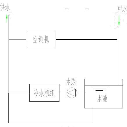 如圖1,為一水池蓄冷系統(tǒng)簡圖,在利用水池冷水供冷時,水泵要克服從水池吸入點到系統(tǒng)的水柱壓力,此外還要克服左側(cè)部分水路的管件、管路、冷水機組以及末端設(shè)備阻力。這樣泵的揚程為上述阻力與水柱壓力之和。