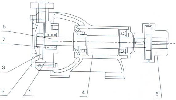主要零件(見(jiàn)結(jié)構(gòu)圖)有(1)泵(2)泵蓋(3)葉輪(4)托架結(jié)合體(5)泵軸(6)爪型彈性聯(lián)軸器(7)特別組合體機(jī)械密封。該型泵與電機(jī)合裝在同一底座上.進(jìn)、出口方向?yàn)樾辫€上.經(jīng)接彎管可変為垂直向上。葉輪在軸上能夠自由地作軸向移動(dòng),泵在工作中葉輪能自行調(diào)節(jié)好與泵體和泵蓋之間的間隙。