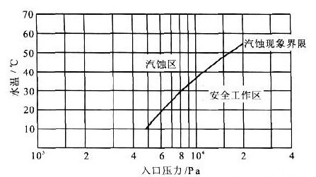 在汽蝕現(xiàn)象界線曲線上方是汽蝕區(qū), 曲線下方是平安工作區(qū)。用戶只需依據(jù)工作水溫, 查找汽蝕現(xiàn)象界線曲線, 只需工作在曲線下方的壓力范圍內(nèi), 就不會發(fā)作汽蝕。